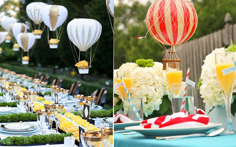 You can create various styles of hot air balloon counter pieces on the wedding table. These hot air balloons can be tied with ribbon or a string net. Tie the hot air balloon with small baskets. You can keep flowers in these baskets. Follow the theme (if any) color in choosing the balloons and flowers.