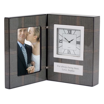 Congratulate someone's accomplishments by personalizing the standout Glen Plaid Photo Frame Clock. This multipurpose frame features a classic style Roman numeral clock and an eye-catching plaid design. Engrave the silver engraving plate with a name and special message.