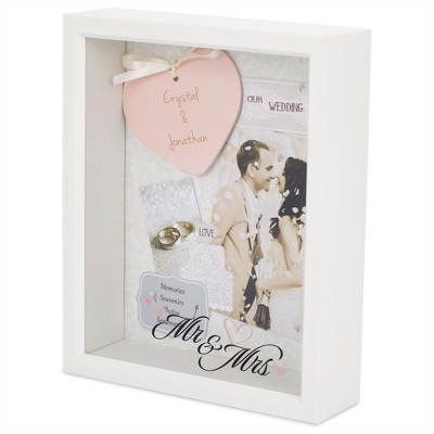 Our personalized Mr. and Mrs. Shadow Box features a white shadow box with a collage backing design for you to add mementos from a wedding or special occasion-or give it as a gift to the happy couple. Engrave names, a monogram or unique message on the wood piece.