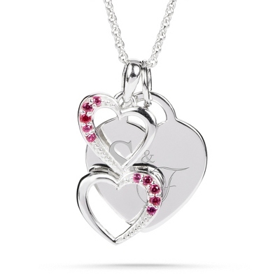 Give her some extra sparkle with our personalized Sterling Silver Entwined Hearts Necklace. The sterling silver chain provides a graceful display for two exquisite pieces-a double heart featuring red stones and a sterling silver engravable charm. Engrave the charm with her initials, a milestone date or monogram and make this Valentine's Day, anniversary or birthday one to always treasure.