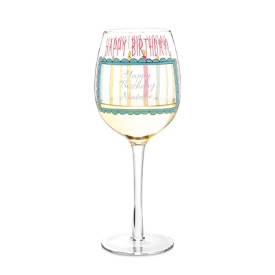 Celebrate birthdays in style with the personalized Birthday Candles Wine Glass. This festive glass comes with a clear box with green bow, making it the perfect gift. Engrave a name monogram or birthday message on the front of the glass.