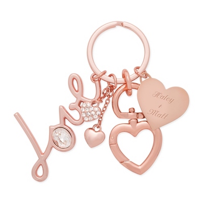 Unlock her affection with our personalized Script Love Key Chain. The modern silhouette of each elegant feature is rendered in a stylish rose-gold finish, and includes a scripted love charm and delicate double hearts. Engrave the heart charm with her initials, a date or personal message.